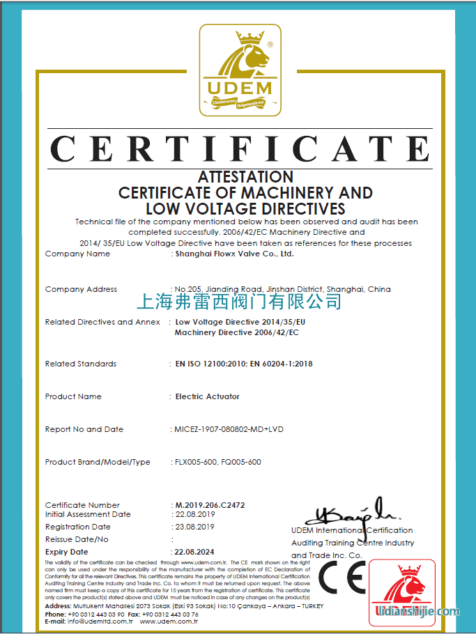 弗雷西電動執行器/電動頭ce認可證書,型號:FLX005-600,FQ005-600