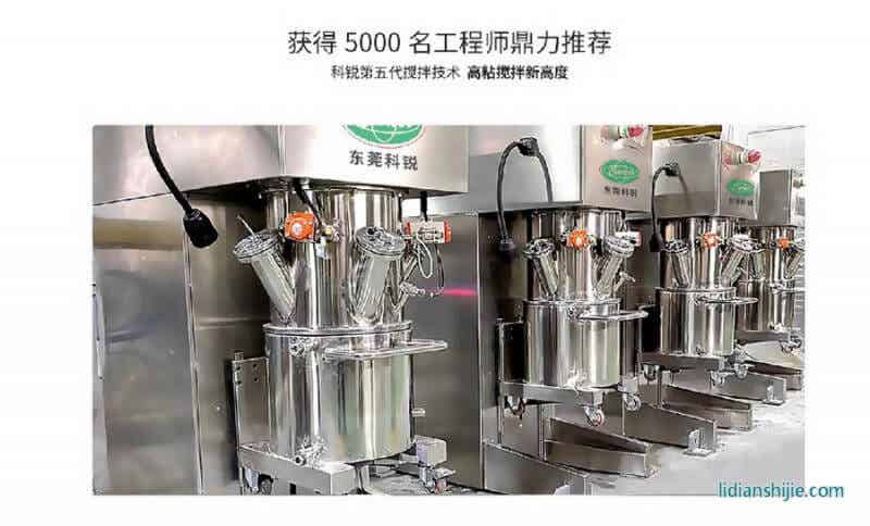 實驗室雙行星強力分散攪拌機是科銳智能針對大專院校、科研單位、工廠實驗室需要處理中高粘度物料所開發的一款新型、高效的攪拌設備。其由低速攪拌器和高速分散器組成,具有良好的混合、反應、分散、混練作用;由于其極大的輸出扭矩,廣泛應用于膠黏劑、硅膠、高檔油墨等領域;同時設備帶刮壁刮底功能,無死角,無殘留。設備帶底座設計,并配有壓料裝置及滑動軌道,實現攪拌、出料一體化作業模式。最終得到均勻的電池漿料以便涂布,是電池生產中的核心工序,鋰離子電池高粘度漿料攪拌工藝(高黏度攪拌工藝:干粉攪拌-浸潤- 捏合攪拌- 稀釋, 剪切,攪拌-成漿) 同時通過抽真空的方式消除漿料中的氣泡。實現漿料均勻性,流動性、電容量的一致性。固含量及導電率等等,得到提高。