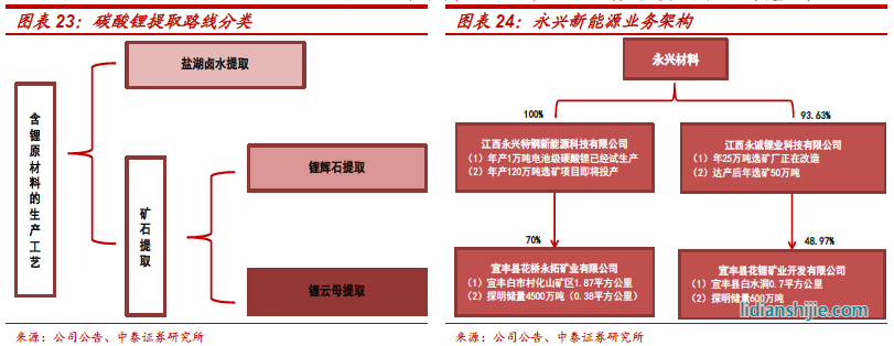 依托國(guó)內(nèi)自有礦山、走鋰云母提鋰道路:碳酸鋰生產(chǎn)工藝主要包括鹽湖提鋰以及礦石提鋰,目前國(guó)內(nèi)多采用固體礦石提取工藝,具體又分為鋰輝石提鋰和鋰云母提鋰。鋰輝石中的鋰含量通常高于鋰云母,更適合用于生產(chǎn)含鋰原材料。但是,鋰輝石礦在國(guó)內(nèi)的資源量少,主要依賴于從澳大利亞等地區(qū)進(jìn)口,運(yùn)輸成本高,供應(yīng)保障穩(wěn)定性相對(duì)不足,致使電池級(jí)碳酸鋰生產(chǎn)成本居高難下。為了保證原材料最大程度的可控,永興依托收購(gòu)的國(guó)內(nèi)礦產(chǎn)資源,堅(jiān)定走鋰云母提鋰道路。目前公司已經(jīng)擁有兩大礦業(yè)公司-花橋礦業(yè)和花鋰礦業(yè),礦區(qū)地處江西宜春,素有“亞洲鋰都”之稱,探明鋰云母氧化鋰總儲(chǔ)量約250萬(wàn)噸, 占全國(guó)氧化鋰資源的15.2%,占全國(guó)礦山鋰資源的62.1%。永拓和花鋰礦業(yè)最新原礦探明儲(chǔ)量分別達(dá)到4500萬(wàn)噸及600萬(wàn)噸,年選礦能力120萬(wàn)噸、50萬(wàn)噸。兩大礦業(yè)公司的存在,為公司碳酸鋰業(yè)務(wù)的發(fā)展打下了堅(jiān)實(shí)基礎(chǔ);