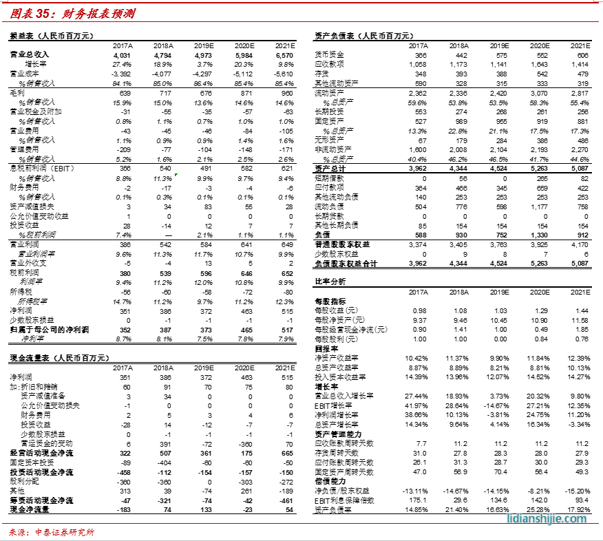 營(yíng)收和利潤(rùn):預(yù)計(jì)公司2019-2021年實(shí)現(xiàn)營(yíng)業(yè)收入分別為49.73億元、59.84億元以及65.70億元,同比分別增長(zhǎng)3.73%、20.32%、9.80%;對(duì)應(yīng)實(shí)現(xiàn)歸母凈利潤(rùn)3.73億元、4.65億元以及5.17億元,同比變化-3.58%、24.75%、11.20%。