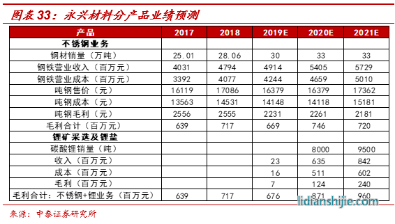重要假設(shè):(1)不銹鋼銷量2019-2021年分別達(dá)到30萬(wàn)噸、33萬(wàn)噸、33萬(wàn)噸;(2)2020年碳酸鋰均價(jià)54000元,2021年碳酸鋰均價(jià)上行至64800元;(3)2020-2021年公司碳酸鋰銷量分別達(dá)到8000噸、9500噸水平;