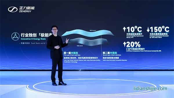 極能態:即雙重半固態電芯技術。正力新能研發了超高鎳正極材料的固態電解質表面修飾技術和固態電解質復合隔膜技術。得益于此,大圓柱電芯的失效起始溫度提升10°C,失效最高溫度降低150°C。功率性能改善上,零下20°C 低溫功率提升了20%。