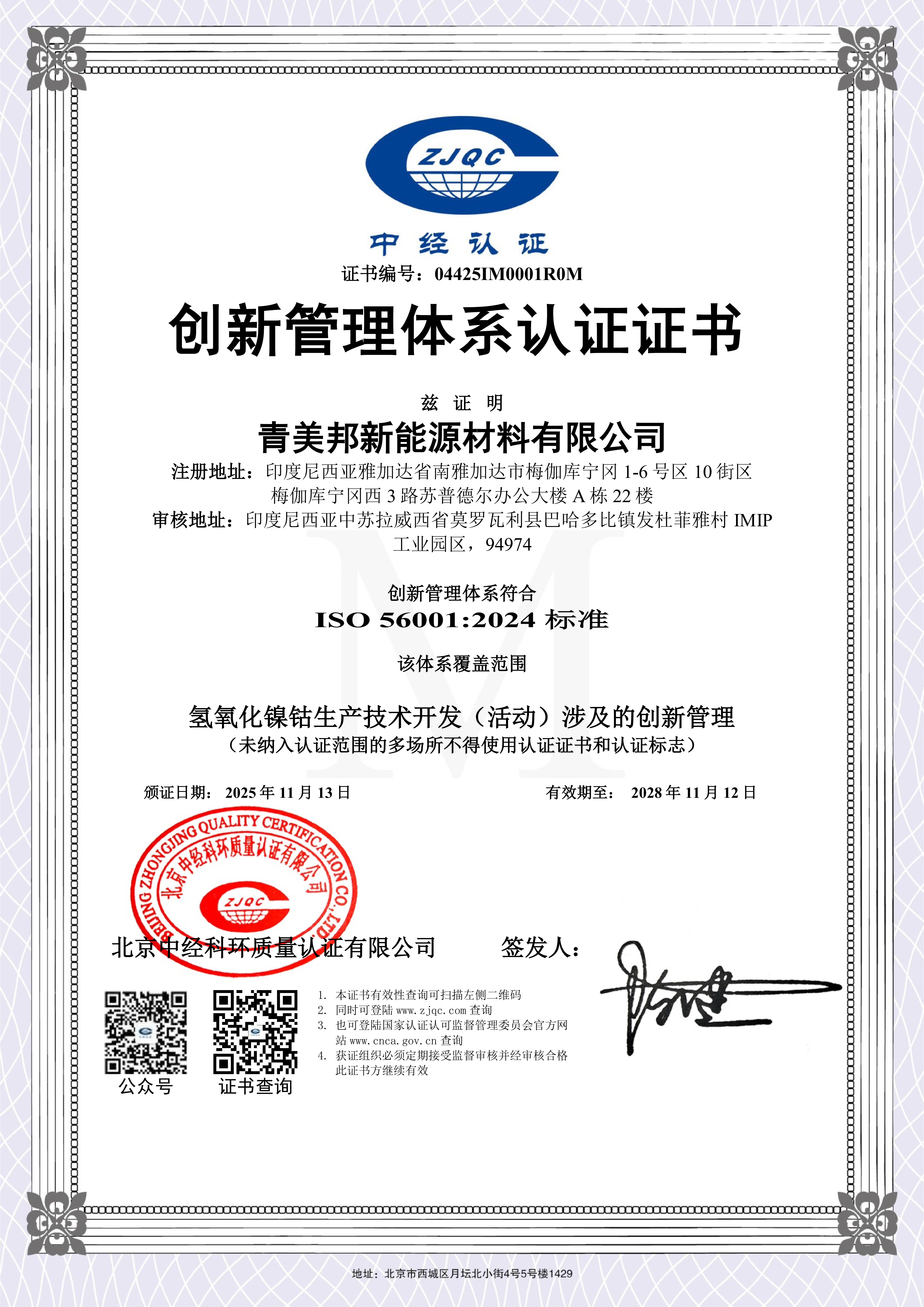 截至2025年11月,格林美股份有限公司及核心子公司青美邦新能源材料有限公司、荊門市格林美新材料有限公司先后通過以上體系認證。